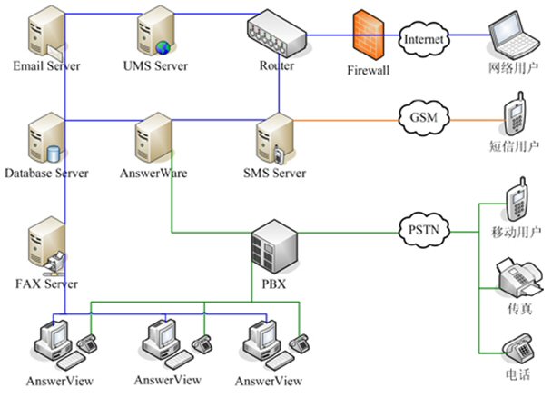 AnswerWare系統(tǒng)包括服務(wù)端控制程序、UMS(統(tǒng)一消息服務(wù))平臺(tái)、DialWare和客戶端程序AnswerView。