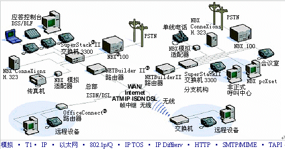 使用標(biāo)準(zhǔn)多協(xié)議路由器,諸如3Com PathBuilder或NET Builder II路由器,您能夠通過(guò)廣域網(wǎng)或Internet將多個(gè)分支機(jī)構(gòu)與您的總部系統(tǒng)相連接。您可以隨意選擇網(wǎng)絡(luò): 支持工業(yè)標(biāo)準(zhǔn)Internet協(xié)議(IP)聯(lián)網(wǎng)的DSL、電纜、幀中繼或ISDN。您甚至能夠通過(guò)使用3Com NBX ConneXtions H.323網(wǎng)關(guān)應(yīng)用,來(lái)充分利用低成本、高質(zhì)量的IP語(yǔ)音 (VoIP) H.323服務(wù)。因?yàn)镹BX ConneXtion使用Internet作為長(zhǎng)途線路上本地到本地的撥號(hào)路徑,因此它能夠以極低的成本提供傳統(tǒng)電話專用線路和后端分機(jī)(OPX)線路的優(yōu)勢(shì)。