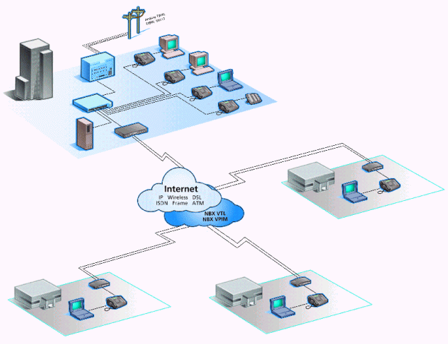 注:企業(yè)架設(shè)NBX通訊系統(tǒng)后,實現(xiàn)SOHO辦公只需要接入Internet架設(shè)VPN網(wǎng)絡(luò),員工可通過小區(qū)寬帶接入或ADSL接入即可實現(xiàn)內(nèi)部通訊就像在企業(yè)內(nèi)部辦公一樣通訊不受任何限制。客戶來電時只需撥打分機號,無論員工在任何地點都可接聽來電。企業(yè)可以通過TCA(通訊助理)軟件給員工發(fā)送公告、組建電話會議、短信通知等應用。
