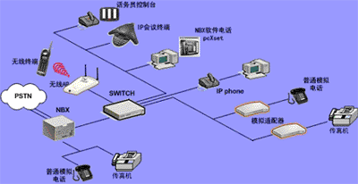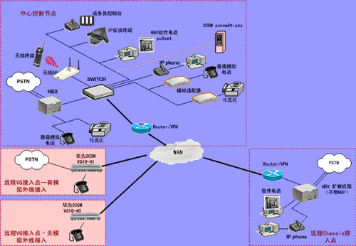 遠(yuǎn)端也可以有單獨(dú)的 IP 話機(jī)(不需要 NBX 呼叫處理器)接入系統(tǒng)。