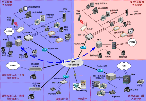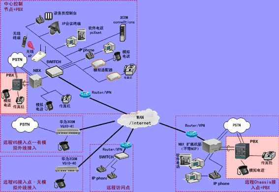 ②.統(tǒng)一的分支機(jī)構(gòu)電話平臺,可以支持任何數(shù)據(jù)骨干網(wǎng)(WAN)技術(shù),包括DDN、幀中繼、VPN、xDSL等。3COM NBX 系統(tǒng)也可以在無線局域網(wǎng)上運(yùn)行。