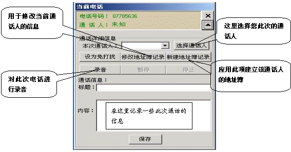 如果有電話打入時,在屏幕的右側(cè)會彈出一個對話框,它顯示了當(dāng)前來電的號碼和通話人(如果在地址簿中沒有記錄則顯示為未知),點(diǎn)擊彈出全部菜單功能,它相當(dāng)于一個功能強(qiáng)大的通話記事本,用它既可以邊接聽電話邊整理相關(guān)通話的文字記錄,又可以錄下通話的全部內(nèi)容。如果這個電話是您不愿接聽的,也可以將它設(shè)置為“免打擾”,這樣,這個號碼以后將存入免打擾名單中,若此號碼再呼入,系統(tǒng)將自動掛斷此呼叫。如果這個電話是您認(rèn)為的重要客戶打過來的,您也可以將此號碼添加到重要客戶組中,以便您今后接聽或設(shè)置電話轉(zhuǎn)移時能與其它呼入電話相區(qū)分。