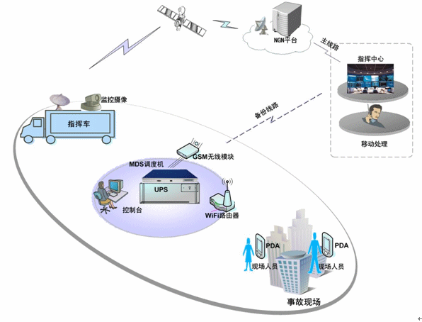 MDS調(diào)度機通過衛(wèi)星道與政府的NGN平臺對接,實現(xiàn)與整個城市的通信系統(tǒng)對接;并通過GSM、CDMA備份線路,實現(xiàn)多通信通道的實時切換,選擇最好的路由進(jìn)行通信。MDS調(diào)度機負(fù)責(zé)語音通訊、調(diào)度作業(yè)和指令消息轉(zhuǎn)發(fā);應(yīng)急指揮車配備調(diào)度機、調(diào)度臺、移動調(diào)度終端、衛(wèi)星接收設(shè)備、監(jiān)控視頻設(shè)備及其他設(shè)備。所有的調(diào)度語音終端都可與MDS調(diào)度系統(tǒng)對接,實現(xiàn)調(diào)度功能及與其他的通信終端進(jìn)行通信。