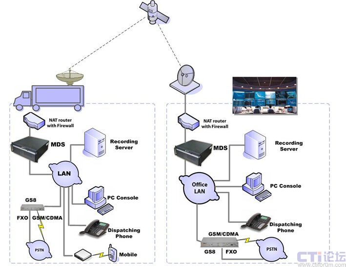 Zed-3的車載調(diào)度系統(tǒng)支持多種接口,通過無線網(wǎng)關提供的GSM、CDMA或模擬中繼端口,可以實現(xiàn)與固定電話、手機等外部電話的互通。即使在現(xiàn)場沒有任何可用的外線資源,例如沒有模擬電話接口,手機卡沒有信號,也仍然可以通過衛(wèi)星鏈路將呼叫連接到指揮中心的網(wǎng)關設備再落地,最大可能的保證現(xiàn)場調(diào)度系統(tǒng)與外部電話的通信。