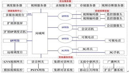 如上圖所示,整體解決方案由后臺服務(wù)器群、指揮中心操作臺、前端視頻設(shè)備、其他語音通信系統(tǒng)等幾部分組成,系統(tǒng)基于IP網(wǎng)絡(luò)部署,所有設(shè)備均直接接入到IP網(wǎng)絡(luò)上,通過IP網(wǎng)絡(luò)匯聚到指揮中心進行交換和統(tǒng)一管理調(diào)度。