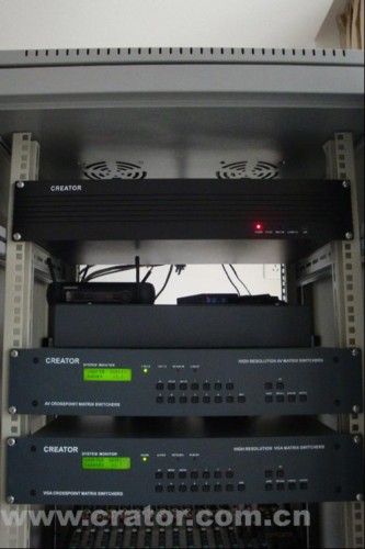 AV作為整個控制系統(tǒng)的核心;使用CREATOR快捷的VGA0808、AV0808矩陣切換器進行音/視頻信號的相互切換;采用CREATOR配備的周邊設(shè)備對會議廳的電力環(huán)境進行智能操控。