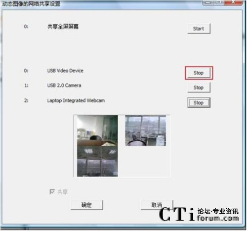打開動(dòng)態(tài)圖像網(wǎng)絡(luò)共享圖像設(shè)置列表,可以看到共享全屏屏幕下面有3個(gè)不同的顯示,這表示在這臺(tái)電腦上一共插了3個(gè)攝像機(jī),點(diǎn)擊顯示欄右側(cè)的“start”,就可以把攝像機(jī)的圖像設(shè)置為共享的圖像,這3個(gè)攝像機(jī)可以同時(shí)共享,也可以只設(shè)置其中的某一個(gè)。點(diǎn)擊“start”后按鈕就會(huì)變?yōu)椤皊top”,這時(shí)攝像機(jī)所獲取到得圖像也會(huì)在列表中顯示。下圖是將3個(gè)攝像機(jī)都設(shè)為共享的圖像的效果: