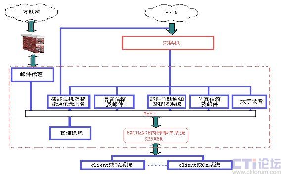 虛線內(nèi)部為統(tǒng)一消息系統(tǒng),所有功能均集成在一臺(tái)高檔PC機(jī)上。