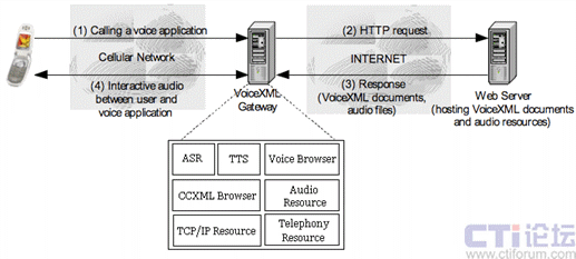 下圖(圖二)展示了基于VoiceXML的語音應(yīng)用系統(tǒng)的基本架構(gòu):