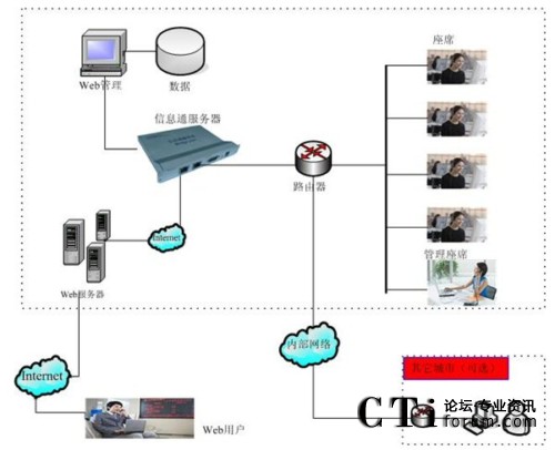 信息通系統(tǒng)的軟硬件部署,主要包括三個部分:信息通用戶工作平臺(客戶端)、信息通服務器(嵌入式設備)、數(shù)據(jù)/文件/管理服務器(其它應用)。其中,在實際應用中,信息通服務器與數(shù)據(jù)/文件服務器可以根據(jù)實際情況整合為一臺服務器。另外,整個系統(tǒng)通過應用網(wǎng)關——信息通服務器設備——與Internet連接,所以,信息通服務器與應用服務器為同一臺服務器。