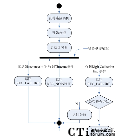 4)如果接收到SC_EVENT_DISCCONET事件,表示用戶主動放棄,返回REC_FAILURE,調(diào)用EndSession,流程結束;如果接收到SC_EVENT_TIMEOUT事件,表示用戶在計時器的時間內(nèi)沒有輸入,返回REC_NOINPUT,調(diào)用EndSession,流程結束;如果接收到SC_EVENT_DTMF_RECEIVED事件,表示用戶輸入完畢,進入下一步;