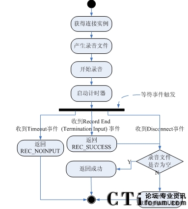 5)如果接收到SC_EVENT_DISCCONET事件,表示用戶主動放棄,轉(zhuǎn)到步驟7;如果接收到SC_EVENT_TIMEOUT事件,表示用戶在計時器的時間內(nèi)沒有輸入,返回REC_NOINPUT,調(diào)用EndSession,流程結束;如果接收到SC_EVENT_RECORD_RECEIVED事件,表示用戶錄音完畢,進入下一步;