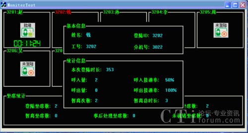 通過(guò)坐席監(jiān)控程序,呼叫中心管理人員可以實(shí)時(shí)監(jiān)控座席的登錄時(shí)間、當(dāng)前狀態(tài)(空閑、忙于外線或內(nèi)線、正在振鈴、免打擾、限制時(shí)間、報(bào)警、退出等)、當(dāng)前狀態(tài)的起始時(shí)間、持續(xù)時(shí)間、與誰(shuí)連接等,從而實(shí)現(xiàn)簡(jiǎn)單明了的質(zhì)檢功能。我們實(shí)現(xiàn)了兩種坐席監(jiān)控:C/S模式和B/S模式。