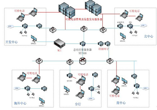 全行所有可視電話均通過數(shù)據(jù)中心(北京)新部署的可視電話管理及信息發(fā)布服務器進行配置、管理及信息展現(xiàn)。