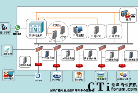 系統(tǒng)主要包含IVR服務(wù)器,CTI服務(wù)器,短信網(wǎng)關(guān),郵件服務(wù)器,傳真服務(wù)器,數(shù)據(jù)庫服務(wù)器,座席系統(tǒng)等?蛻魮艽蛱胤柎a接入廣電公司客服系統(tǒng),首先由IVR提供自動語音服務(wù)。CTI服務(wù)器負(fù)責(zé)所有的電話的路由、排隊(duì)、轉(zhuǎn)接和控制?蛻粼诮邮茏詣诱Z音服務(wù)時,如果需要人工幫助,可選擇轉(zhuǎn)入人工座席。由IVR系統(tǒng)向CTI發(fā)出轉(zhuǎn)接請求,完成轉(zhuǎn)接功能。