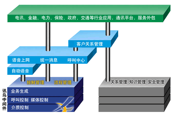 而要支撐這些復(fù)雜的應(yīng)用,中間件應(yīng)該可以進(jìn)行接觸管理、流程管理。和目前已有的關(guān)系管理、知識管理、安全管理結(jié)合,可以全方位的支撐應(yīng)用系統(tǒng)。訊鳥中間件就是這樣的中間件,它是建立在分布式計(jì)算環(huán)境上,可以控制多種通訊設(shè)備,支撐生成多種業(yè)務(wù)應(yīng)用軟件的軟件。它可以支持語音網(wǎng)的交互,因特網(wǎng)的交互,支持呼叫和數(shù)據(jù)的同步傳輸。它支持工作流程的生成,而不用了解一個(gè)工作流程是如何在不同的設(shè)備上運(yùn)行。同時(shí),它的業(yè)務(wù)描述語言是用中文和圖標(biāo)表達(dá),易于和業(yè)務(wù)接軌,方便系統(tǒng)集成商、最終客戶,給系統(tǒng)分析員提供優(yōu)秀的設(shè)計(jì)工具和運(yùn)行平臺,極大提高了工程的實(shí)施效率。