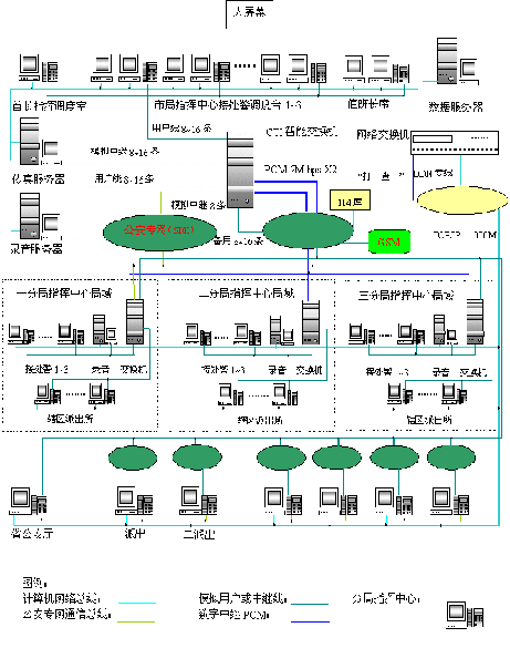 - 樹立大網(wǎng)絡(luò)概念:采用先進(jìn)的通訊、計算機(jī)網(wǎng)絡(luò)技術(shù)(采用CTI可編程交換技術(shù)),利用現(xiàn)有的通信資源,實現(xiàn)市局指揮中心與消防大隊、交警大隊、各派出所的計算機(jī)網(wǎng)絡(luò)及相關(guān)領(lǐng)導(dǎo)辦公室計算機(jī)大聯(lián)網(wǎng);形成全市范圍內(nèi)110、119、122有線、無線全方位立體調(diào)度語音通道大網(wǎng)。