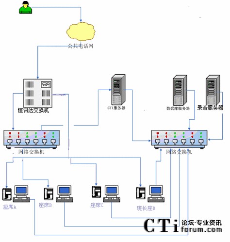 根據(jù)以上業(yè)務(wù)設(shè)計(jì)框架,我們確定了客服中心搭建時(shí)所需要的設(shè)備,系統(tǒng)的拓?fù)浣Y(jié)構(gòu)示意如下: