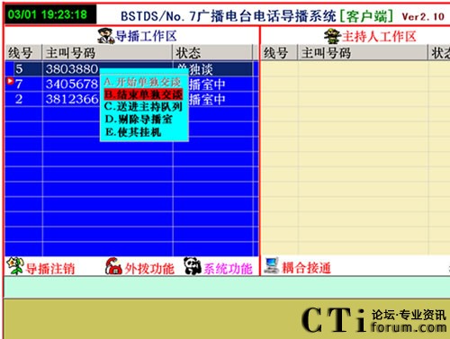 2、參與者打進(jìn)電話時(shí),導(dǎo)播區(qū)顯示電話號(hào)碼,同時(shí)導(dǎo)播電腦的音箱會(huì)發(fā)出鈴聲,這時(shí)導(dǎo)播用鼠標(biāo)右鍵點(diǎn)擊顯示的主叫號(hào)碼會(huì)出現(xiàn)一個(gè)菜單。   如想接聽哪個(gè)電話號(hào)碼,用右鍵點(diǎn)擊這個(gè)號(hào)碼會(huì)出現(xiàn)菜單,在菜單中只有三種命令可以選擇“單獨(dú)交談”“剔除導(dǎo)播室”“使其掛機(jī)”。點(diǎn)擊“開始單獨(dú)交談”后拿起電話聽筒,這時(shí)導(dǎo)播可以單獨(dú)同參與者通話了,其他參與者聽不到交談,只能聽到音樂聲,導(dǎo)播問明參與者參與內(nèi)容后須接入直播間的,應(yīng)按“結(jié)束單獨(dú)交談”后點(diǎn)擊“送到主持列隊(duì)”送到主持人區(qū)等待主持人同參與者交談。