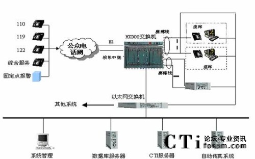 綜合接警平臺(tái)主要由hxd09可編程智能語音交換機(jī)和計(jì)算機(jī)網(wǎng)絡(luò)兩部分組成,交換機(jī)負(fù)責(zé)110、119、122報(bào)警電話的接入與分流及調(diào)度呼出等功能;計(jì)算機(jī)網(wǎng)絡(luò)則完成110、119、122報(bào)警信息的顯示、數(shù)據(jù)儲(chǔ)存、統(tǒng)計(jì)及信息查詢、發(fā)布功能。