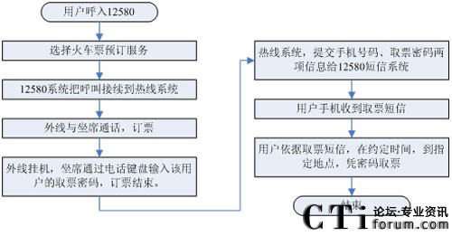 1、用戶通過手機電話訂票,首先進(jìn)入12580系統(tǒng),在12580系統(tǒng)中選擇訂票服務(wù),12580系統(tǒng)通過與訂票熱線的語音線路,把用戶接續(xù)到訂票熱線系統(tǒng)。