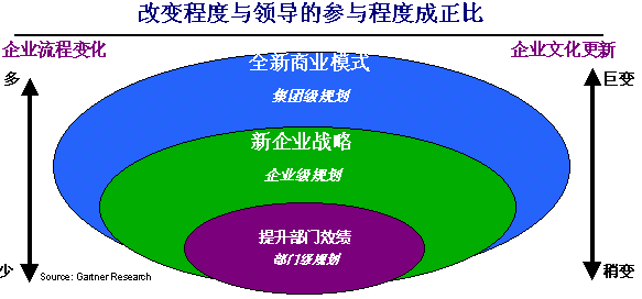 成功實(shí)施CRM的第一個(gè)關(guān)鍵是贏得企業(yè)的高層支持。高層支持的項(xiàng)目,或稱“一把手”工程,往往能夠推行得比較順利。在我們的實(shí)施中,最經(jīng)常項(xiàng)目牽頭人是客戶方負(fù)責(zé)運(yùn)營(yíng)的老總或總經(jīng)理。企業(yè)要應(yīng)用CRM系統(tǒng),不應(yīng)當(dāng)僅僅是信息部門或銷售部門內(nèi)部的事情,而應(yīng)當(dāng)是整個(gè)企業(yè)在高層領(lǐng)導(dǎo)的直接參與指導(dǎo)之下的多方協(xié)同調(diào)整,因?yàn)镃RM涉及的是市場(chǎng)、銷售、服務(wù)等多個(gè)與客戶打交道的部門和流程。企業(yè)內(nèi)部的高層管理者必須承擔(dān)起項(xiàng)目負(fù)責(zé)人的角色,才能讓CRM實(shí)施順利地開展,才能完成部門之間的協(xié)同,才能實(shí)現(xiàn)企業(yè)內(nèi)部的文化轉(zhuǎn)變。高層參與的程度可以由下面的圖示說明: