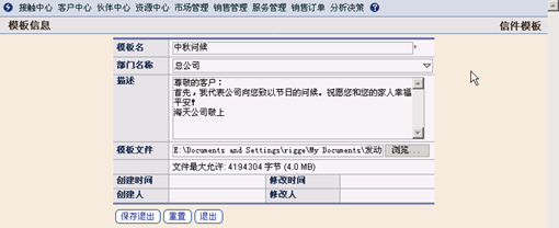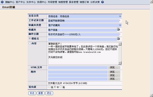 電子郵件接觸方式可以方便企業(yè)在極短的時(shí)間內(nèi)為大量的客戶發(fā)布各種信息,比如:企業(yè)需要為客戶提供的促銷信息、服務(wù)通告,或者節(jié)日問候等。TurboCRM系統(tǒng)可以將郵件模板與選取的客戶資料進(jìn)行自動匹配,瞬間即可將信息發(fā)送給大量客戶。