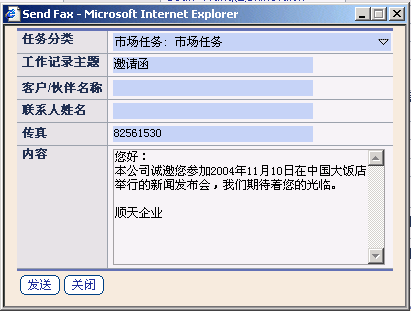 在與客戶進(jìn)行接觸的時(shí)候,為了提高信息傳遞的及時(shí)性,傳真也是一個不錯的選擇。TurboCRM系統(tǒng)可以幫助企業(yè)通過發(fā)送傳真的形式與自己的客戶進(jìn)行接觸,比如:企業(yè)需要在短時(shí)間內(nèi)發(fā)送一批活動邀請函和申請表,就可以利用這種發(fā)送批量傳真的形式,比之信件的傳遞方式不僅節(jié)省成本,而且為企業(yè)節(jié)省了寶貴的時(shí)間。