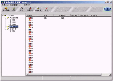 用戶接入:系統(tǒng)啟動后,如果用戶電話呼入,則系統(tǒng)自動接聽,并提請用戶輸入密碼校驗(yàn)后進(jìn)入會議系統(tǒng)。也可'集體撥號'、'單個撥號''點(diǎn)名'