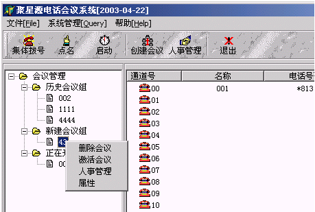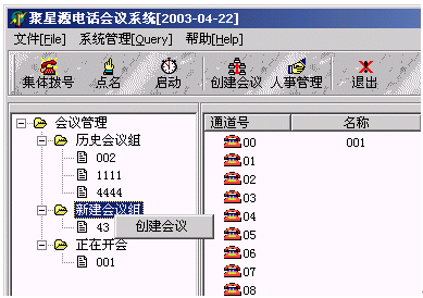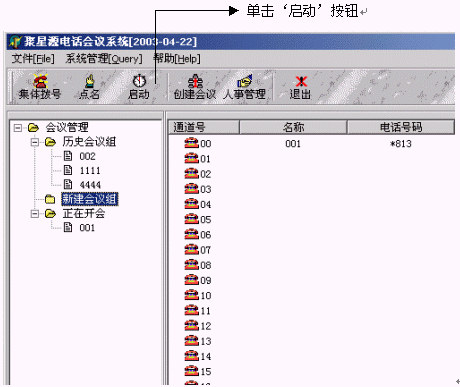 3、系統(tǒng)上方是工具欄,包括:創(chuàng)建會議、人事管理、啟動、集體撥號、雙工/單工、點(diǎn)名、電話薄等快捷鍵。