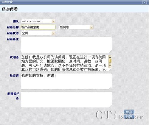 添加功能用來添加新問卷,這里你可以根據(jù)業(yè)務的需要設(shè)定所需要得信息,例如問卷的歡迎語,結(jié)束語,配額提示語等信息,自定義輸入信息。