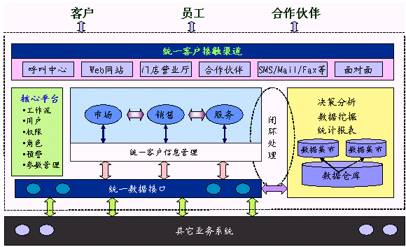 HOLLYCRM(合力金橋軟件公司)推出的HollyCRM是全面集成的客戶關(guān)系管理解決方案,覆蓋協(xié)作型CRM、運(yùn)營型CRM和分析型CRM的全部范疇。HollyCRM通過telephone、Email、Fax、WAP、Web、PDA、Face to Face等各種各樣渠道與客戶互動(dòng),通過市場(chǎng)營銷(Marketing)、銷售(Sales)和服務(wù)(Service)等業(yè)務(wù)流程的管理,將客戶的各種背景信息、偏好、行為習(xí)慣、交易數(shù)據(jù)、信用狀況等信息收集并整合在一起,再將這些運(yùn)營數(shù)據(jù)和外來的市場(chǎng)數(shù)據(jù)經(jīng)過整合和變換,裝載進(jìn)數(shù)據(jù)倉庫(Data Warehouse)后,運(yùn)用OLAP和數(shù)據(jù)挖掘(Data Mining)等技術(shù)來從數(shù)據(jù)中分析和提取相關(guān)規(guī)律、模型和趨勢(shì),把有關(guān)客戶信息和知識(shí)在整個(gè)企業(yè)內(nèi)得到有效的流轉(zhuǎn)和共享,并進(jìn)一步轉(zhuǎn)化為企業(yè)的戰(zhàn)略規(guī)劃和科學(xué)決策,用于提高在所有渠道上同客戶交互的有效性和針對(duì)性,把合適的產(chǎn)品和服務(wù),通過合適的渠道,在適當(dāng)?shù)臅r(shí)候,提供給適當(dāng)?shù)目蛻,從而?shí)現(xiàn)利潤的最大化。