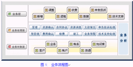 網(wǎng)通一站服務(wù)業(yè)務(wù)系統(tǒng):實現(xiàn)業(yè)務(wù)受理、資源確認(rèn)、費(fèi)用確認(rèn)、合同/協(xié)議、收費(fèi)、資源調(diào)度、竣工、業(yè)務(wù)預(yù)警、申告投訴處理、技術(shù)支持處理功能。其業(yè)務(wù)流程如下圖: