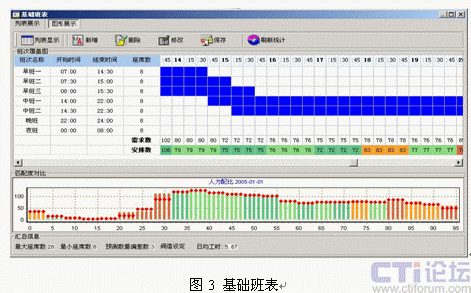 引入呼叫中心排班系統(tǒng)是提升坐席資源利用率的有效解決方案,排班系統(tǒng)可以對(duì)大量的歷史呼叫數(shù)據(jù)進(jìn)行分析,并剔除特殊事件對(duì)呼叫量的影響,從而得出呼叫量變化的規(guī)律曲線,再輔助對(duì)特殊預(yù)期事件影響度的疊加,可以對(duì)未來一定時(shí)間的呼叫量變化做出比較客觀的預(yù)測(圖2)。在預(yù)測話務(wù)量變化曲線的同時(shí),結(jié)合人員技能和班次設(shè)定,給出高擬合度的人工排班方案(圖3)。更為重要的是,成熟排班系統(tǒng)提供的話務(wù)預(yù)測模型多具備學(xué)習(xí)能力,能夠?qū)㈩A(yù)測的話務(wù)數(shù)據(jù)與實(shí)際話務(wù)數(shù)據(jù)進(jìn)行對(duì)比,從而不斷提高話務(wù)預(yù)測模型的預(yù)測精度。成熟排班工具可以在保持呼叫中心同等服務(wù)水平的前提下,降低人工坐席代表的投入數(shù)量,進(jìn)而釋放部分人工資源開展其它業(yè)務(wù)。