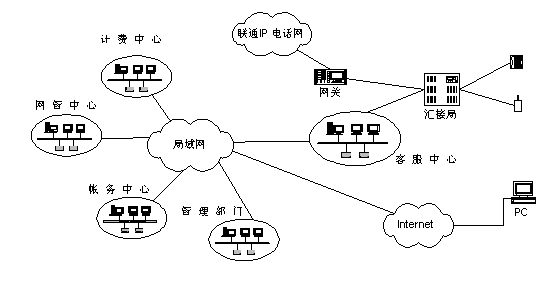 聯通北京分公司將客戶服務系統(tǒng)與現有計費、營業(yè)、帳務系統(tǒng)進行組織,形成了一個有機的結合體,能夠充分發(fā)揮出現有系統(tǒng)的優(yōu)勢?蛻舴⻊障到y(tǒng)從營業(yè)帳務系統(tǒng)提取相關用戶資料,建立客戶服務的系統(tǒng)資料庫,從計費系統(tǒng)提取相關用戶話費資料等供查詢使用。同時客服系統(tǒng)還將與北京聯通現有的計費、營業(yè)、帳務、網管等相關系統(tǒng)以及Internet相連,提供業(yè)務處理和用戶自助服務等業(yè)務。本客服中心通過2對路由器和DDN專線與聯通北京分公司現有的局域網(包括管理部門、網管中心、計費中心、帳務中心等相關系統(tǒng))連接,并通過該局域網訪問Internet。