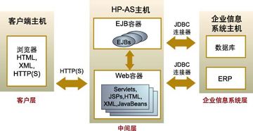 在一個開發(fā)環(huán)境中把上述3層一般都安裝在同一臺計算機上,以便模擬3層環(huán)境。這樣,開發(fā)者在實際環(huán)境開發(fā)應用之前,可以快速開發(fā)和測試應用?墒牵趯嶋H環(huán)境中,各個層一般位于不同的計算機上。圖2表示了HP-AS是如何采用J2EE技術(shù)實現(xiàn)分布式應用的。