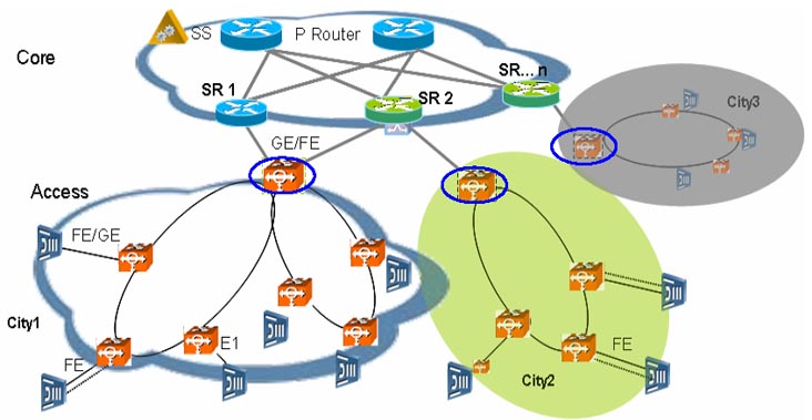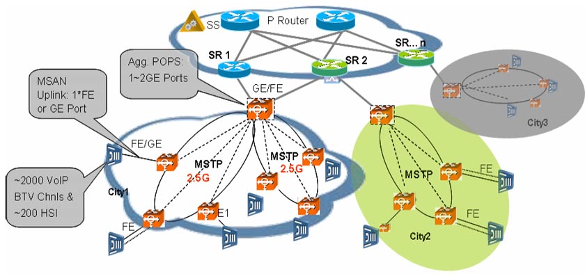 MSAN已經(jīng)逐漸成為基于IP架構(gòu)的下一代電信網(wǎng)建網(wǎng)的主要接入方式,近幾年越來越多的固網(wǎng)運營商普遍采用綜合接入(MSAN)建網(wǎng)模式,如英國的最大固網(wǎng)運營商英國電信的21CN網(wǎng)絡,中國的最大固網(wǎng)運營商中國電信、中國網(wǎng)通,巴西的最大固網(wǎng)運營商Telemar等。而MSTP單一平臺具備支持MSAN接入的所有業(yè)務的承載要求,且成本最低。華為公司MSTP設(shè)備具有強大的數(shù)據(jù)接入?yún)R聚及傳送特性,并通過Metro