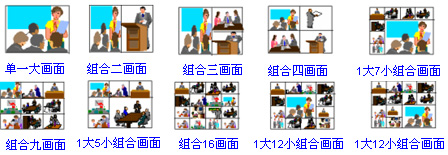 華為高清視訊系統(tǒng)采用了數(shù)字多畫面合成技術(shù),系統(tǒng)全面提供2、3、4、6、8、9、13、16等不同的9種畫面組合模式,在會(huì)議過程中,多畫面的格式可以通過主席或管理員隨意切換,同時(shí)會(huì)議過程中也可以在單多畫面之間的自由切換。支持的多畫面組合模式如下: