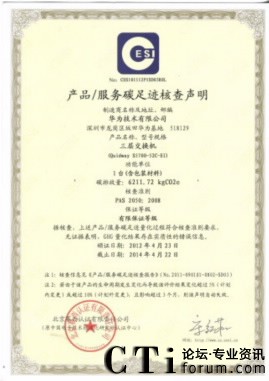 CTI論壇(ctiforum)5月23日消息(記者 楊佳林):全球領(lǐng)先的ICT解決方案供應(yīng)商華為宣布,華為S5700系列交換機(jī)產(chǎn)品(共4款,S5700-28-EI-24S、S5700-48TP-SI-AC、S5700-52C-EI、S5700-52C-SI)經(jīng)中國(guó)電子技術(shù)標(biāo)準(zhǔn)化研究所認(rèn)證中心(以下簡(jiǎn)稱CESI)認(rèn)證核查,產(chǎn)品碳足跡量化過(guò)程符合核查準(zhǔn)則要求,獲得“碳足跡認(rèn)證”證書(shū)。這是國(guó)內(nèi)第一張交換機(jī)產(chǎn)品碳足跡認(rèn)證證書(shū),10日在深圳舉行的“2012中國(guó)碳排放認(rèn)證認(rèn)可技術(shù)國(guó)際論壇”上,主辦方CESI向華為授予了該證書(shū)。