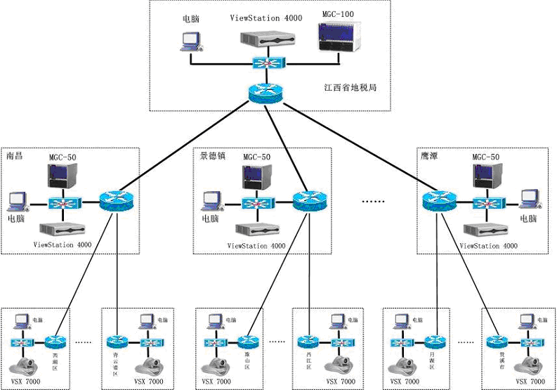 江西省地方稅務局是主管地方稅收的省人民政府直屬機構。內(nèi)設辦公室、政策法規(guī)處、人事處、流轉稅管理處,等10個職能處(室)。全系統(tǒng)共有機構1193個,其中省局1個,設區(qū)市局11個,縣(市、區(qū))級地稅局(分局)115個,基層分局(所)625個,事業(yè)單位333個,直屬單位108個。長期以來省局與下屬各部門之間聯(lián)系不便,每年都需要頻繁召開省局與下屬分局的大小會議來進行工作部署、交流以及統(tǒng)一的學習、培訓等等,不僅消耗了大量的時間,也耗費了很多的人力和物力。因此急需建立起一個完善的、功能強大的視頻會議系統(tǒng)。該系統(tǒng)建成后,應實現(xiàn)以省局為中心連通下屬各個市、分局,以市、分局為中心,向下聯(lián)通各自所轄基層分局,實現(xiàn)全省稅務機關的遠程電視會議、遠程培訓、視頻檔案等功能。