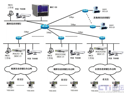 在株洲、邵陽和永州市行采用級聯(lián)的方式來實(shí)現(xiàn)。具體實(shí)現(xiàn)方式為:VSX 7000E則和地市行的MGC-25通訊,并且MGC-25負(fù)責(zé)其縣支行終端的接入,同時用MGC-50和MGC-25的端口級聯(lián),采用這種連接方式就可以實(shí)現(xiàn)從省行-地市行-縣支行的三級網(wǎng)視頻會議的召開。
