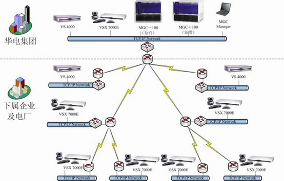 華電集團(tuán)領(lǐng)導(dǎo)十分重視電力信息化及華電集團(tuán)電子政務(wù)的建設(shè)工作。為了貫徹國(guó)務(wù)院對(duì)政府系統(tǒng)信息化建設(shè)的要求,實(shí)現(xiàn)華電集團(tuán)政務(wù)辦公和行業(yè)管理信息服務(wù)的電子化、網(wǎng)絡(luò)化,滿足華電集團(tuán)建立辦事高效、運(yùn)轉(zhuǎn)協(xié)調(diào)、行為規(guī)范的行政管理體制的要求,加快推進(jìn)電力行業(yè)信息化建設(shè),華電集團(tuán)決定開(kāi)展華電集團(tuán)信息化建設(shè)二期工程建設(shè),即在現(xiàn)有的基礎(chǔ)上再增加一臺(tái)MCU以及在下屬企業(yè)及電廠增加37臺(tái)終端。鑒于POLYCOM在視頻會(huì)議強(qiáng)大的技術(shù)優(yōu)勢(shì)以及神州數(shù)碼在視頻會(huì)議系統(tǒng)建設(shè)和實(shí)施上的雄厚實(shí)力和豐富經(jīng)驗(yàn),華電集團(tuán)決定包括MCU和終端的所有設(shè)備都采用POLYCOM的產(chǎn)品。整個(gè)系統(tǒng)主要建立在華電集團(tuán)現(xiàn)有的視頻會(huì)議的基礎(chǔ)之上,依據(jù)H.323標(biāo)準(zhǔn)協(xié)議建設(shè)視頻會(huì)議系統(tǒng)二期組網(wǎng)。其中,控制中心新增一臺(tái)POLYCOM公司的MGC+100多點(diǎn)控制單元(即MCU);POLYCOM 高性能的VSX7000E作為下屬企業(yè)及電廠主接點(diǎn)視頻會(huì)議終端。