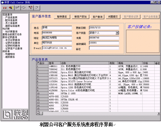 聯(lián)想神州數(shù)碼電子商務部于2000年7月承建利盟中國公司客戶服務中心系統(tǒng),該客戶服務系統(tǒng)可以為利盟全國的用戶提供產(chǎn)品、信息、價格、咨詢等服務;服務方式包括人工、語音、傳真、郵件等。