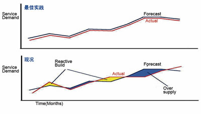下一代網(wǎng)絡(luò)的IP化、智能化的趨勢,使得服務(wù)路徑從靜態(tài)路由為主向動態(tài)化、共享化轉(zhuǎn)變。這種轉(zhuǎn)變使得主動的網(wǎng)絡(luò)容量規(guī)劃在下一代運營環(huán)境中具有更加重要的意義。準(zhǔn)確、真實、主動的網(wǎng)絡(luò)容量計劃和趨勢分析能力將成為對OSS解決方案的關(guān)鍵需求。網(wǎng)絡(luò)規(guī)劃不僅可以幫助運營商準(zhǔn)確分配網(wǎng)絡(luò)容量,而且可以減少容量不足和失敗訂單,并可通過找出利用率不足的網(wǎng)絡(luò)資源來提高網(wǎng)絡(luò)運行效率,如圖3所示。