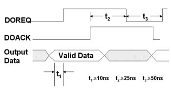 mode),相較于序列式的數(shù)據(jù)傳輸,并行傳輸提供了簡單且更高速的數(shù)據(jù)傳輸方式,不過其技術(shù)關(guān)鍵在于發(fā)送端與接收端之間的時序差問題,因此,針對此時序差的問題,高速數(shù)字I/O卡需提供握手模式,讓兩張卡以交握信號確保數(shù)據(jù)的正確性。下圖為數(shù)據(jù)輸出的時序圖: