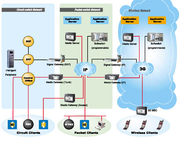 在下一帶網(wǎng)絡(luò)(NGN)中媒體網(wǎng)關(guān)在軟交換(softswitch)的控制下,將一種網(wǎng)絡(luò)中的媒體轉(zhuǎn)換成另一種網(wǎng)絡(luò)所要求的媒體格式。如媒體網(wǎng)關(guān)能夠在電路交換網(wǎng)的承載通道和分組網(wǎng)的媒體流之間進(jìn)行轉(zhuǎn)換,可以處理音頻、視頻或T.120,也具備處理這三者任意組合的能力,并且能夠進(jìn)行全雙工的媒體翻譯,可以演示視頻/音頻消息,實(shí)現(xiàn)其他IVR功能,同時還可以進(jìn)行媒體會議等。