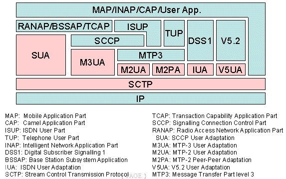 圖中粉紅色部分為SIGTRAN的協(xié)議棧,在它們之上的是對應(yīng)的電話信令協(xié)議。SIGTRAN的協(xié)議棧分為2層:一層是SCTP,它提供多個流的,可靠的數(shù)據(jù)傳輸,用戶數(shù)據(jù)的捆綁和分段,阻塞和流量控制,防止"拒絕服務(wù)"和"偽裝"的攻擊等功能。另一層是用戶適配層,圖中由SUA、M3UA、M2UA、M2PA、IUA和V5UA五個適配模塊所組成,它們分別來滿足各種電話信令協(xié)議適配的要求。