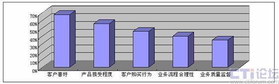 那么保險(xiǎn)企業(yè)希望通過進(jìn)一步深入開展電話中心信息化工作得到哪些效用或者有價(jià)值的信息呢,我們認(rèn)為,電話中心為保險(xiǎn)企業(yè)所提供的信息中最重要的依然是“客戶的聲音”,具體來說,包括客戶喜好和客戶購買行為等,其次便是業(yè)務(wù)流程信息。企業(yè)管理層對來自電話中心的不同信息的關(guān)注程度如下圖所示。