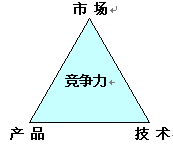 企業(yè)要發(fā)展, 關鍵于企業(yè)的核心競爭力, 企業(yè)如何具有核心競爭力, 特別是通信企業(yè), 我認為, 通信企業(yè)要具有核心競爭力, 決定于三個因素: 市場, 產品, 技術. 這三個因素構筑企業(yè)強大競爭力---競爭力三角型. 三角型的邊則是產品經理的活動軌道. 圖1-1