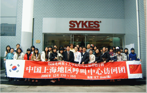 2006年12月14日上午,韓國光州女子大學呼叫市場營銷系30多名大學學生 在鄭成教授等的帶領(lǐng)下,專程來滬參觀訪問賽科斯(Sykes)公司。韓國光州女子大學是韓國第一個設(shè)立呼叫市場營銷專業(yè)的大學,該專業(yè)為四年制本科,學生畢業(yè)后主要從事客戶服務(wù)行業(yè)的基層管理崗位工作。
